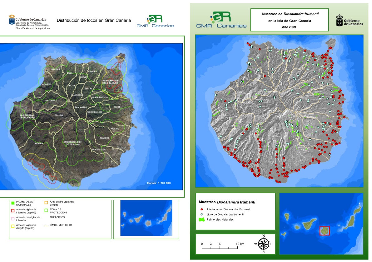 Ill. Distribution des 2 principaux ravageurs du palmier, Rhynchophorus et Diocalandra, dans les îles Canaries. Source: http://invasionesbiologicas.blogspot.fr/Plusieurs fléaux menacent de nos jours le palmier des Canaries, sur l’archipel et dans l’ensemble de la diaspora ornementale. Le premier est le charançon rouge (Rhynchophorus ferrugineus). Venu d’Orient il y a une vingtaine d’années, ce ravageur est en train de conduire à l’éradication de l’ensemble de la palmeraie ornementale. Moins connu, Diocalandra frumenti est un autre ravageur particulièrement présent sur l’archipel des Canaries (et tout aussi préoccupant). Une dernière menace provient de l’hybridation avec d’autres palmiers, principalement le palmier dattier suite à son introduction dans l’archipel comme arbre d’ornement.