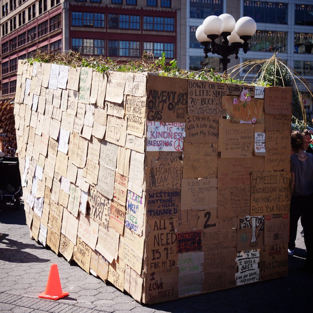 « It is traditional to eat and sleep in the sukkah for one week each fall, as a way of practicing a kind of ceremonial homelessness and empathizing with those who don’t have a roof over their heads. As a political statement, and as a way of transferring the prize money to those in need, Sukkah of the Signs is clad with cardboard signs purchased from destitute individuals across the country. »